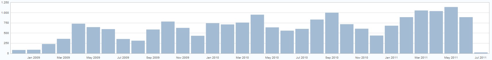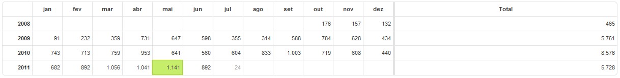 O gráfico bacaninha aí embaixo mostra a quantidade de acessos mensais, desde Dezembro de 2008. Do claro movimento cíclico dos acessos, que são sempre menores na metade e no final do ano (não me perguntem porquê, seus folgados 😀 ), percebe-se que esse ano de 2011 já está um patamar acima, se comparado com os outros.